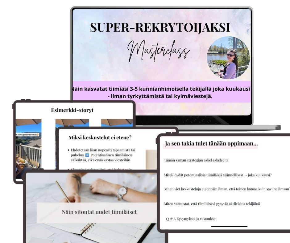 Ja nyt haluan jakaa sinulle parhaat vinkit ja strategiat tiimin kasvattamiseen upouudella Super-rekrytoijaksi Masterclass-luennolla.